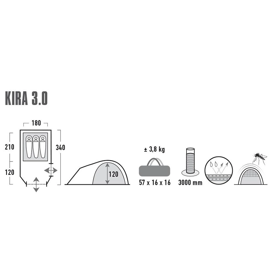 Namiot dla 3 osób Kira od firmy High Peak wyposażony został w dwa wejścia - przednie i boczne. Otwory wentylacyjne. Przestronny przedsionek sprawdzi się jako kuchnia czy pomieszczenie gospodarcze. Wejście wyposażone jest w moskitierę. Szwy laminowane i wodoodporność 3000 mm gwarantują bardzo dobrą ochronę przed deszczem. Dwupowłokowy. Technologia Vario Vent Control utrzymuje świeże powietrze wewnątrz namiotu. W suficie uchwyt na lampę.