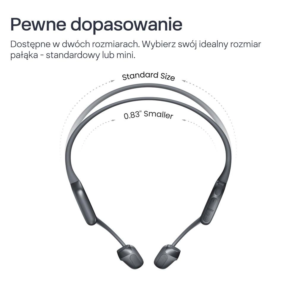 - Technologia przewodnictwa kostnego – zapewnia doskonałą jakość dźwięku, jednocześnie pozostawiając uszy otwarte na dźwięki otoczenia.