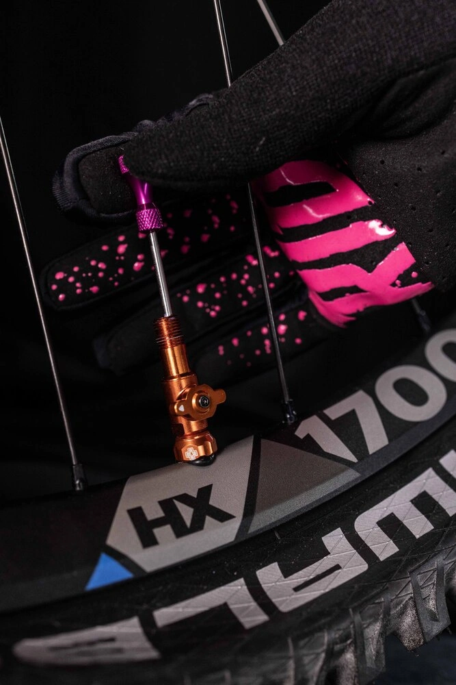 - Po spuszczeniu powietrza z opony, usuń rdzeń zaworu z zaworu bezdętkowego lub otwórz dźwignię na zaworze bezdętkowym Muc-Off Big Bore.