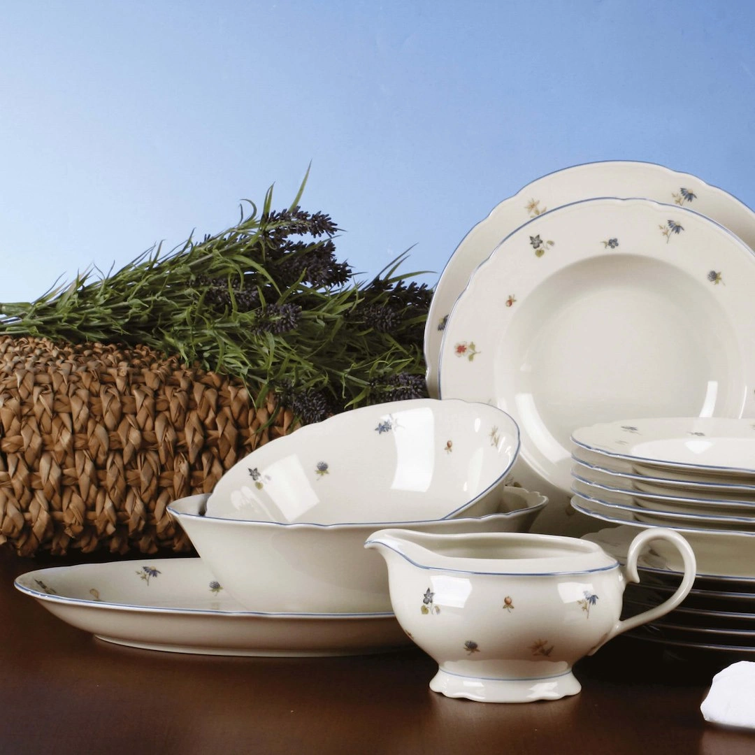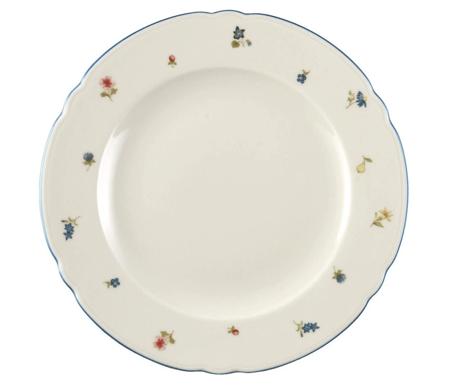 Wykonany z porcelany w odcieniu kości słoniowej talerz zdobi wielobarwny motyw polnych kwiatów, który tworzy na stole przytulną, sielską atmosferę. Całość uzupełnia delikatna niebieska obramówka, podkreślająca klasyczne piękno i ponadczasowy charakter kolekcji.