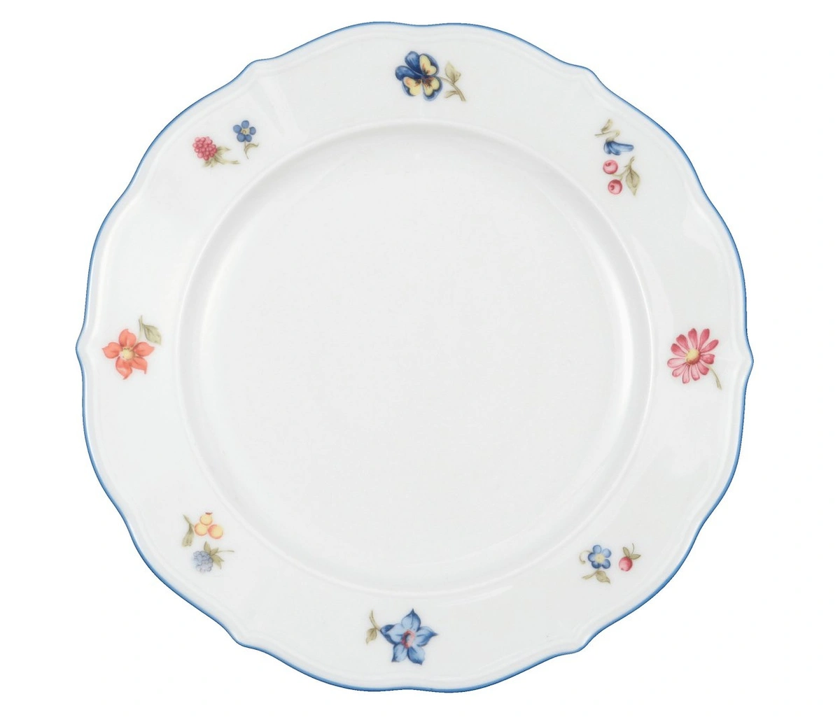 Wykonany z białej porcelany, talerz zdobi subtelny motyw polnych kwiatów, nadający mu sielski, spokojny charakter. Niebieska obwódka oraz lekko falowane krawędzie dodają mu lekkości i elegancji, a trwała porcelana zapewnia wieloletnie użytkowanie.