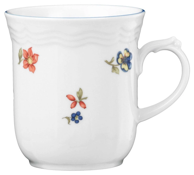 Wykonany z porcelany w śnieżnobiałym odcieniu, kubek zdobi delikatny motyw polnych kwiatów, przywodzący na myśl sielskie krajobrazy. Niebieska obwódka i lekko falowane brzegi dodają mu subtelnego wdzięku, a solidność wykonania gwarantuje trwałość na długie lata codziennego użytkowania.